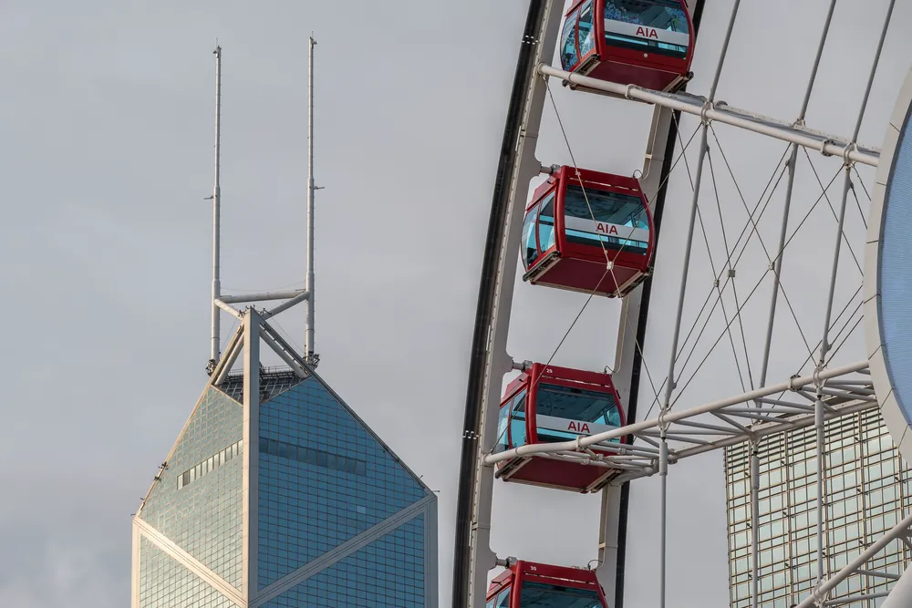 从码头出来便可以看到中环的摩天轮,因为我之前有在大阪的Hep Five坐摩天轮恐高的经历,所以我这次没有坐。不过在这里可以用长焦拍到摩天轮和中银大厦同框