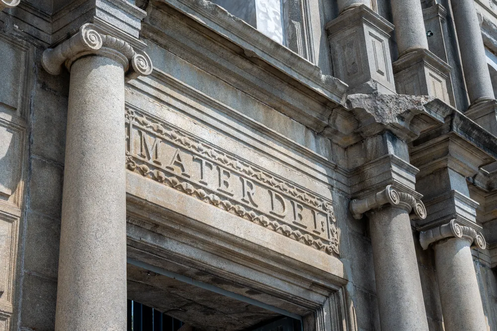 在大三巴的中间的门上,有一个“MATER DEI”,译为“天主圣母”,代表这个教堂的原名:圣保禄圣母学院教堂