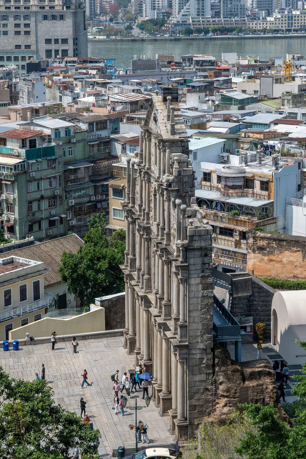 站在大炮台可以看到大三巴牌坊其实看上去挺薄的,估计澳门政府应该时不时地进行加固,能看出靠后面的石砖是后砌的