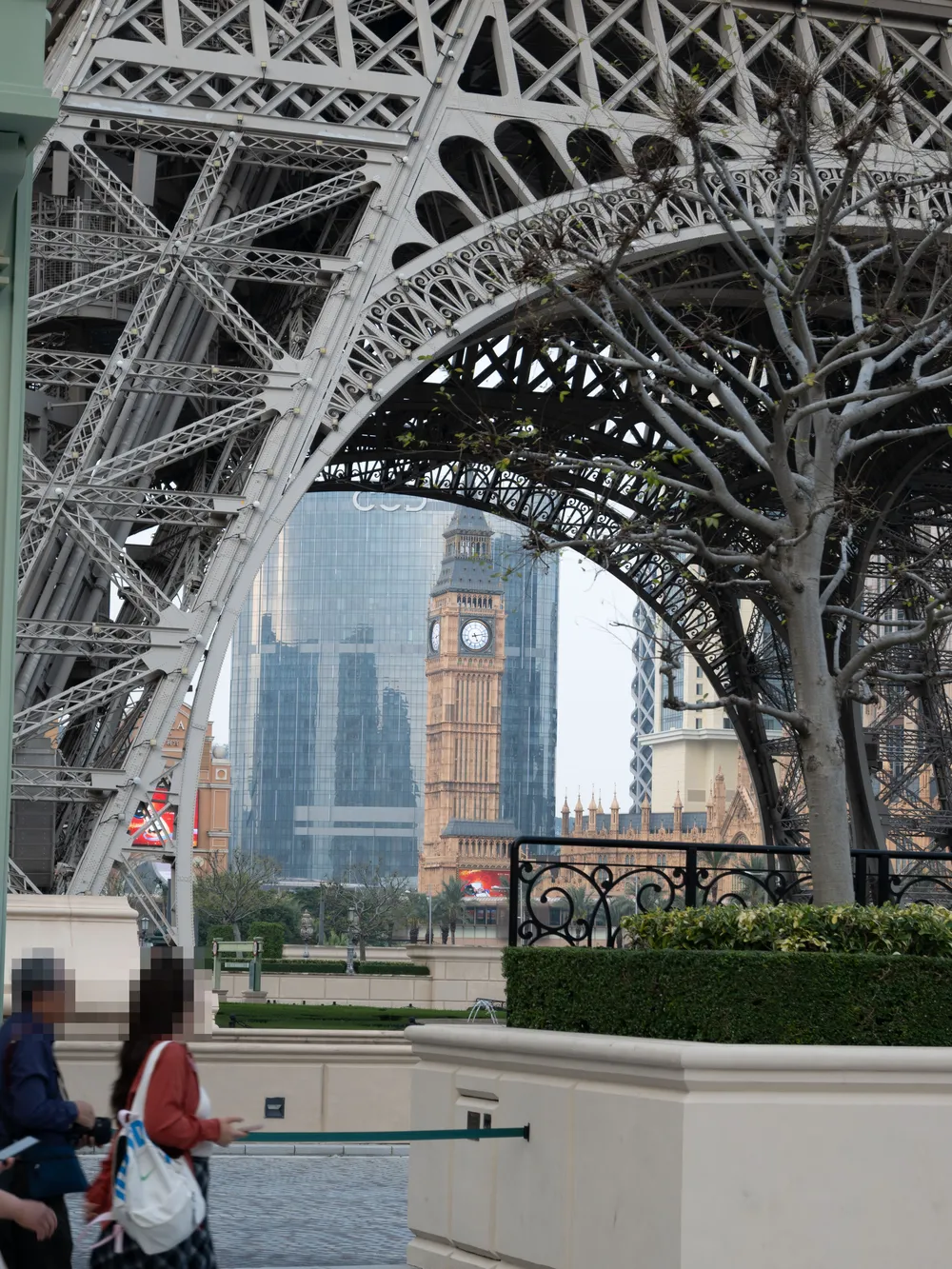 这附近有三个综合体是连在一起的——威尼斯人、巴黎人和伦敦人,威尼斯人的特色就是上面各位看到的模拟威尼斯的水城,而巴黎人和伦敦人则是放置了一个小号的埃菲尔铁塔和大本钟,因此甚至可以看到埃菲尔铁塔和大本钟同框(逆天视角)