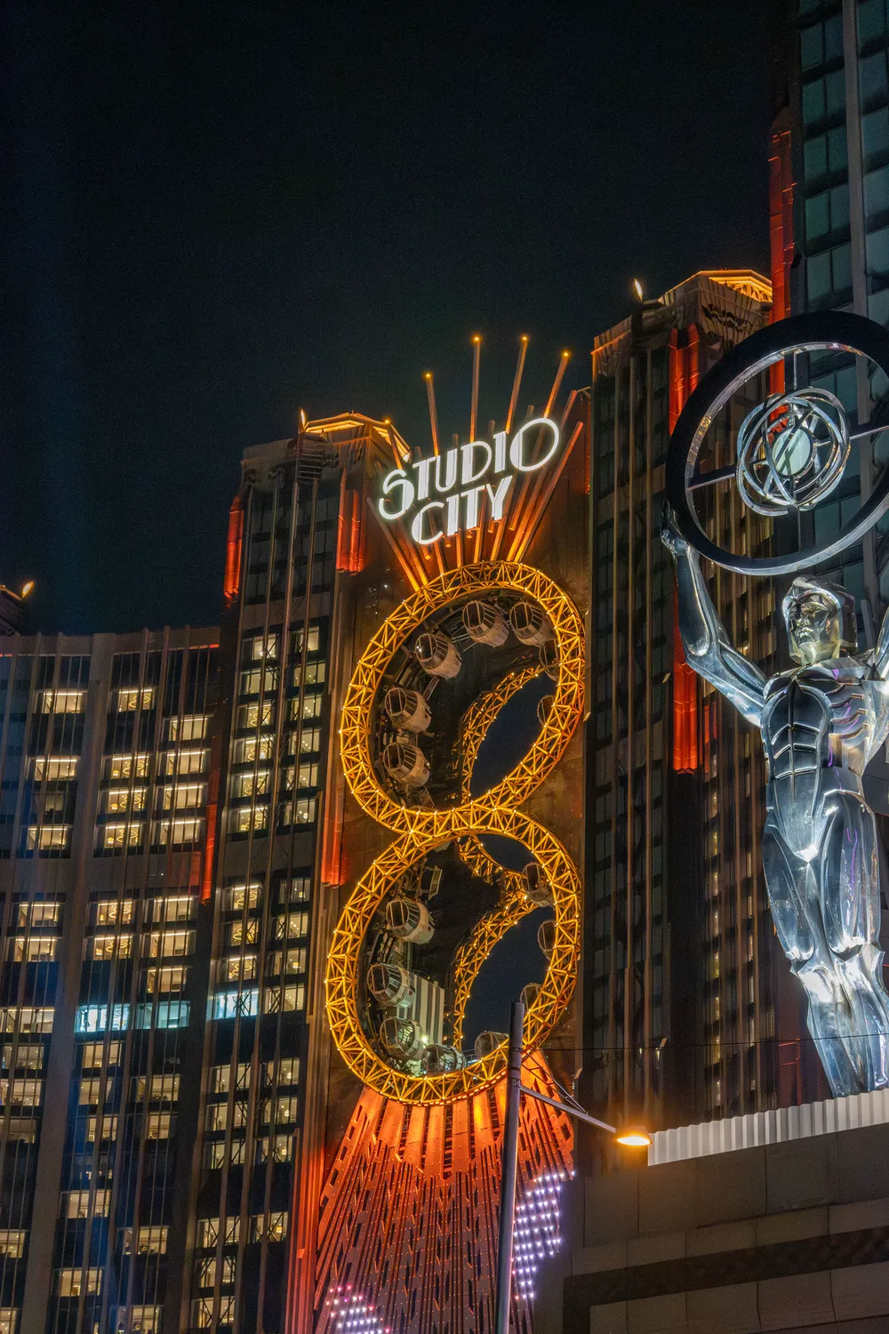 在准备回去的时候正好可以看到另外一个综合体——新濠影汇,就在巴黎人的旁边,但是我并没有进去(逛多了感觉这些综合体都大差不差),这个综合体最具特色的就是中间那个全球唯一一个8字形的内环摩天轮(不过我去的时候貌似没有开)