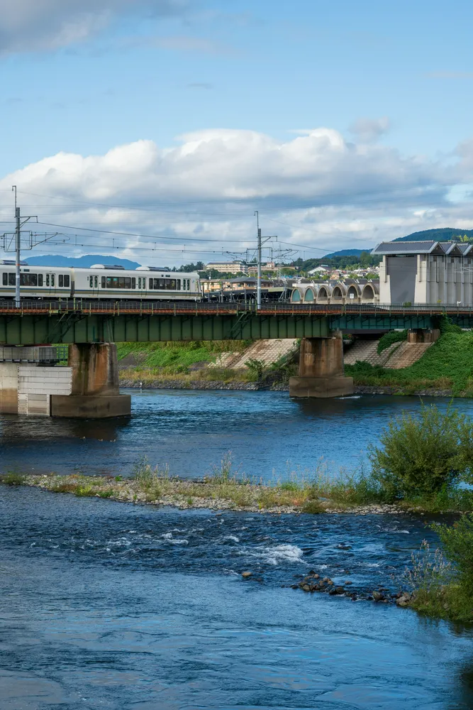 宇治城区有一个宇治桥,这个桥边可以拍到非常不错的电车飞驰的景色