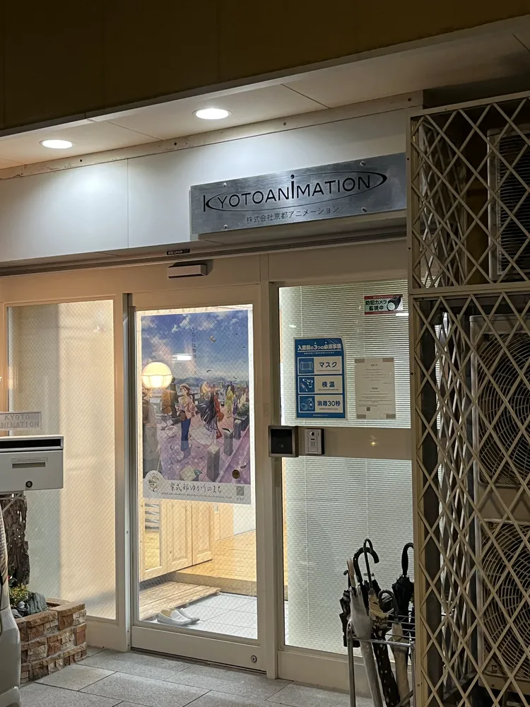 我在回去的时候顺便看了看现在的京都动画工作室(京都动画第一工作室),这个工作室就在JR木幡站旁边(一出站就可以看到),门上的那幅画的背景就是宇治桥