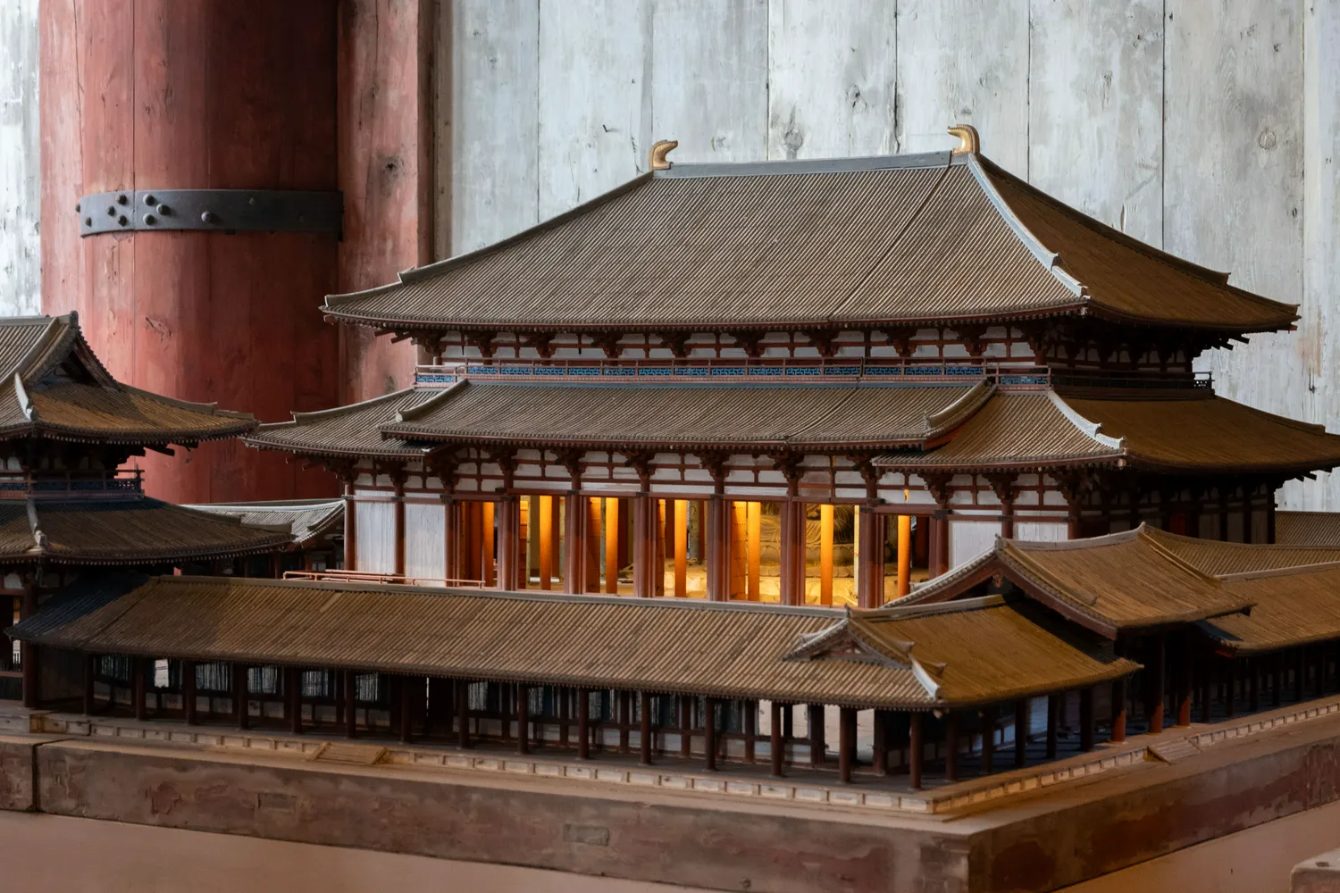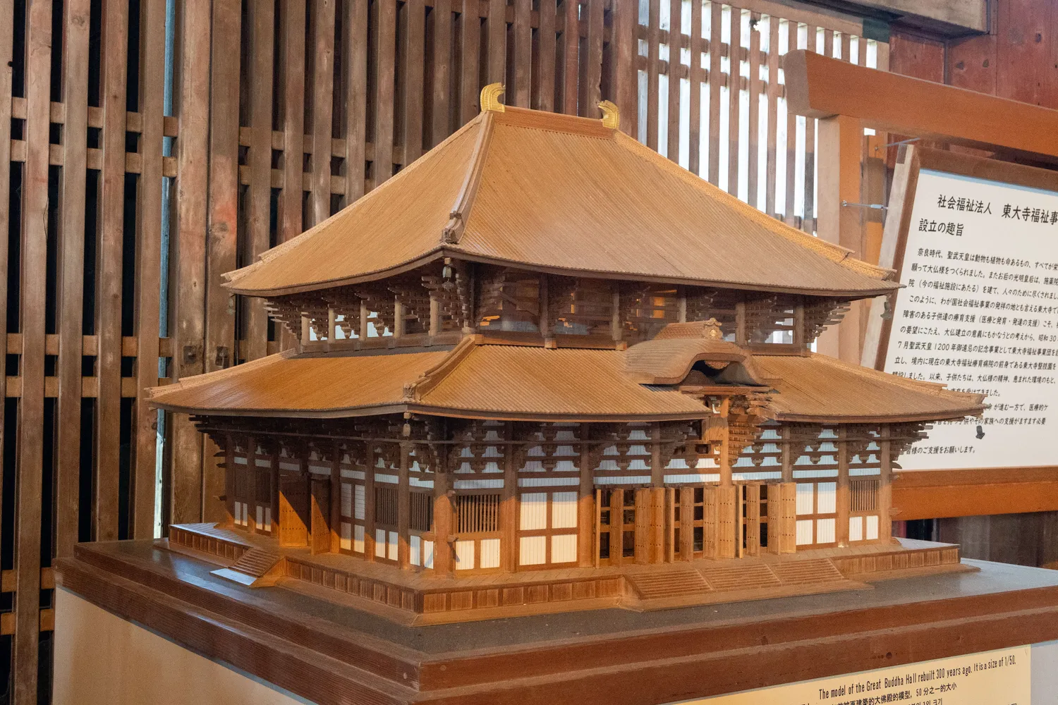 在佛像的背后有历代的东大寺的模型,初代的东大寺长这样的,所以唯一能说得上“唐风”的就是这个初代东大寺,而现在的东大寺(第三代)完全是重新设计的新建筑