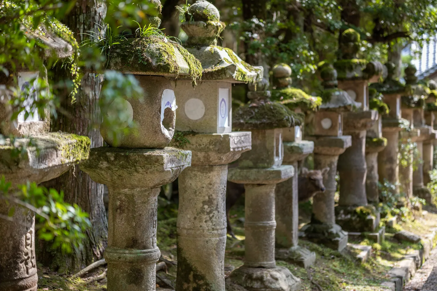 再往里走就是春日大社,这也算奈良最有名的景点之一了,入口附近的石灯笼就非常有氛围